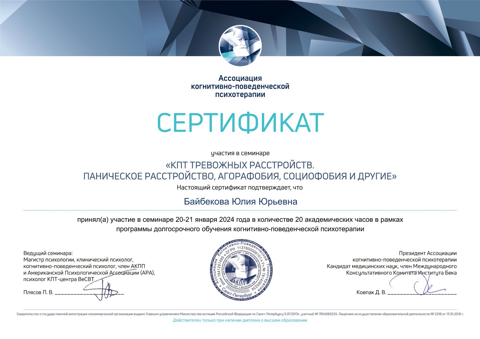 7. Январь 2024 «КПТ тревожных расстройств. Паническое расстройство. Агорафобия. Социофобия и др.»;