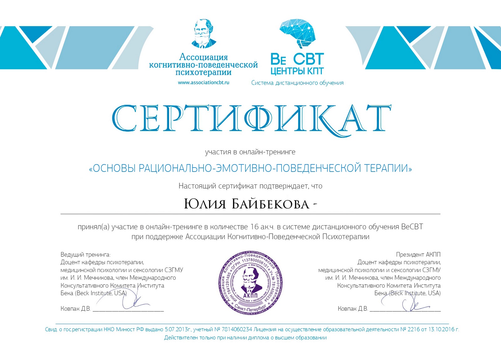 «Основы РЭПТ» (Ассоциация когнитивно-поведенческой психотерапии, 2021г. (20 ч)