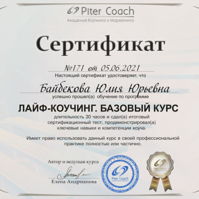 «Лайф коучинг. Базовый курс» (Питеркоуч, 2021г. (30 ч)