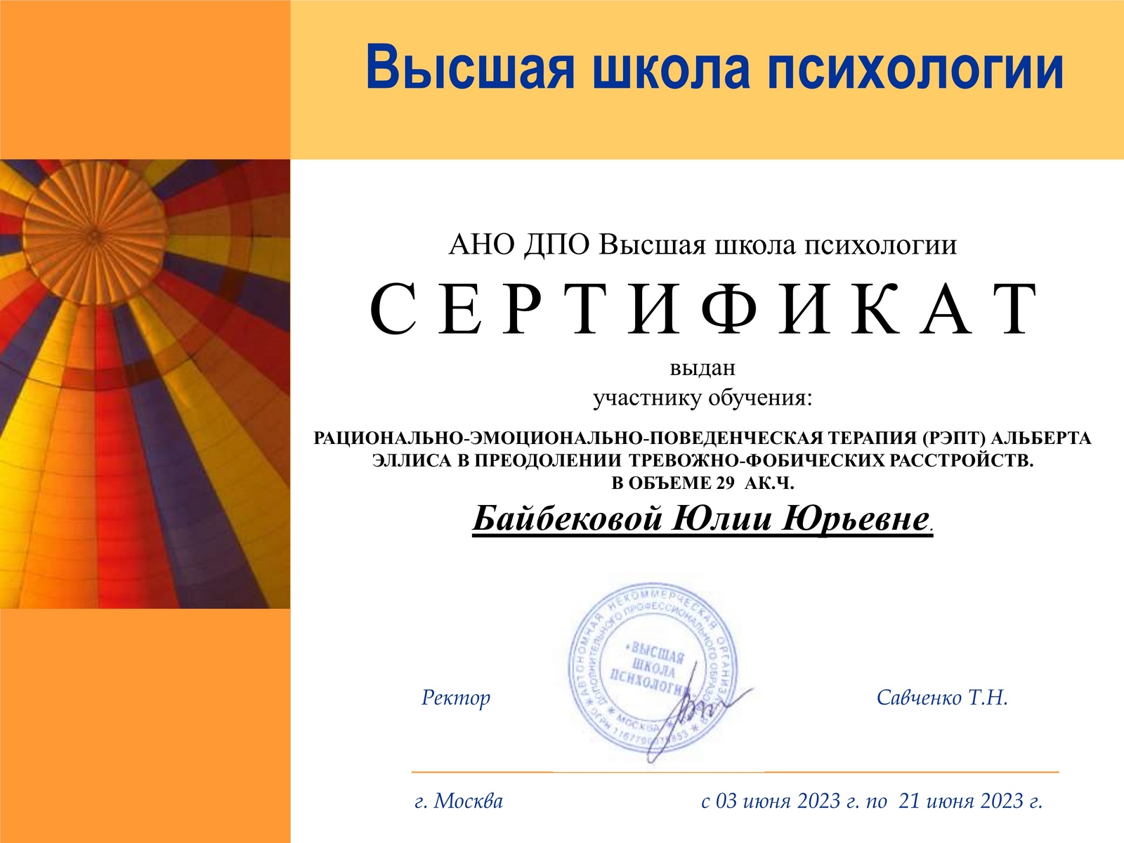 «РЭПТ А. Эллиса в преодолении тревожно-фобических расстройств» (АНО ДПО «Высшая школа» (Е.А. Ромек), 2023г (29ч)