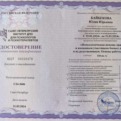 «Психологическая помощь прямым и косвенным участникам боевых действий и их родственникам. Основы работы с ПТСР» (Санкт-Петербургский Институт ДПО для психологов и психотерапевтов, 2024г (144ч)