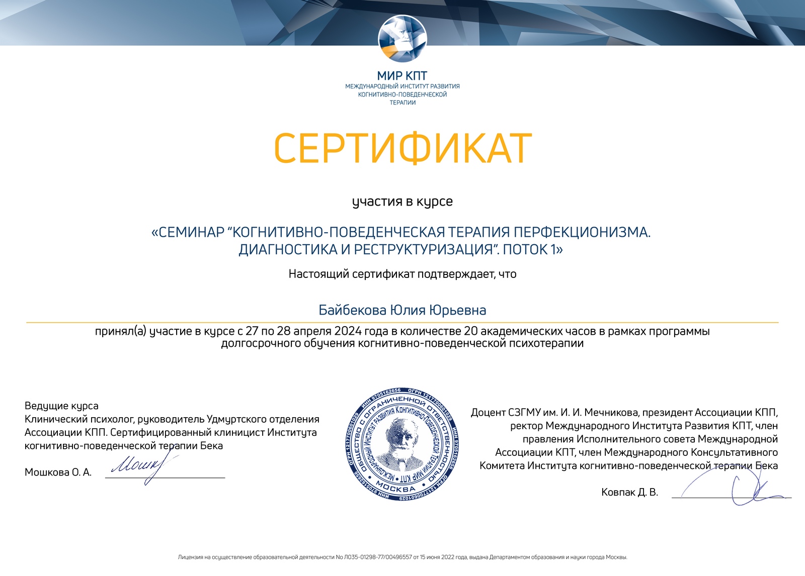 «Когнитивно-поведенческая терапия перфекционизма. Диагностика и реструктуризация» (Международный институт развития когнитивно-поведенческой терапии, 2024г. (20 ч)b>