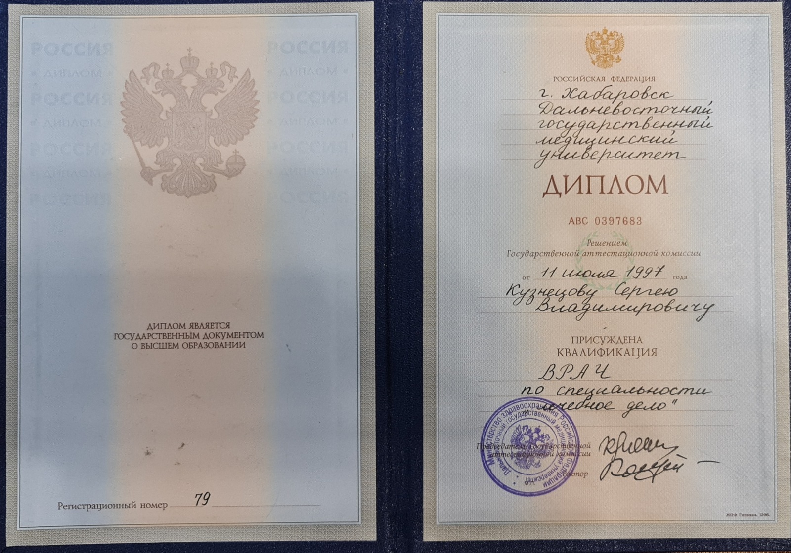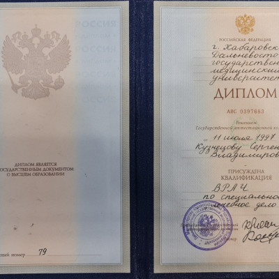 Дальневосточный Государственный медицинский университет, специальность «Лечебное дело», 1997 г.