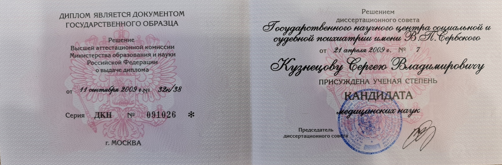 Кандидат медицинских наук (Государственный научный центр социальной и судебной психиатрии имени В.П. Сербского г. Москва, 2009 г.)