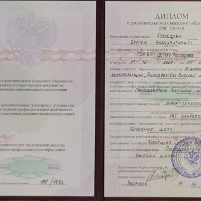 «Преподаватель Высшей школы» (Дальневосточный государственный медицинский университет г. Хабаровск, 2009-2010 гг.)