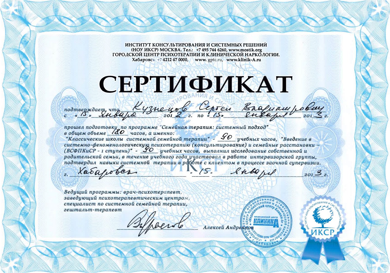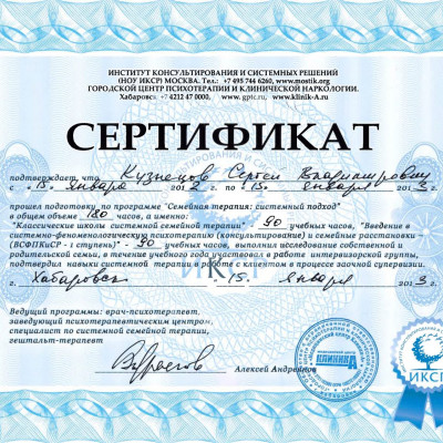 «Семейная терапия: системный подход» (НОУ Институт консультирования и системных решений, 2012-2013 гг. (180ч)