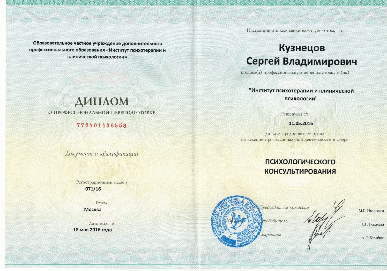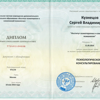 «Психологическое консультирование» (ОЧУ ДПО Институт психотерапии и клинической психологии, 2016 г.)