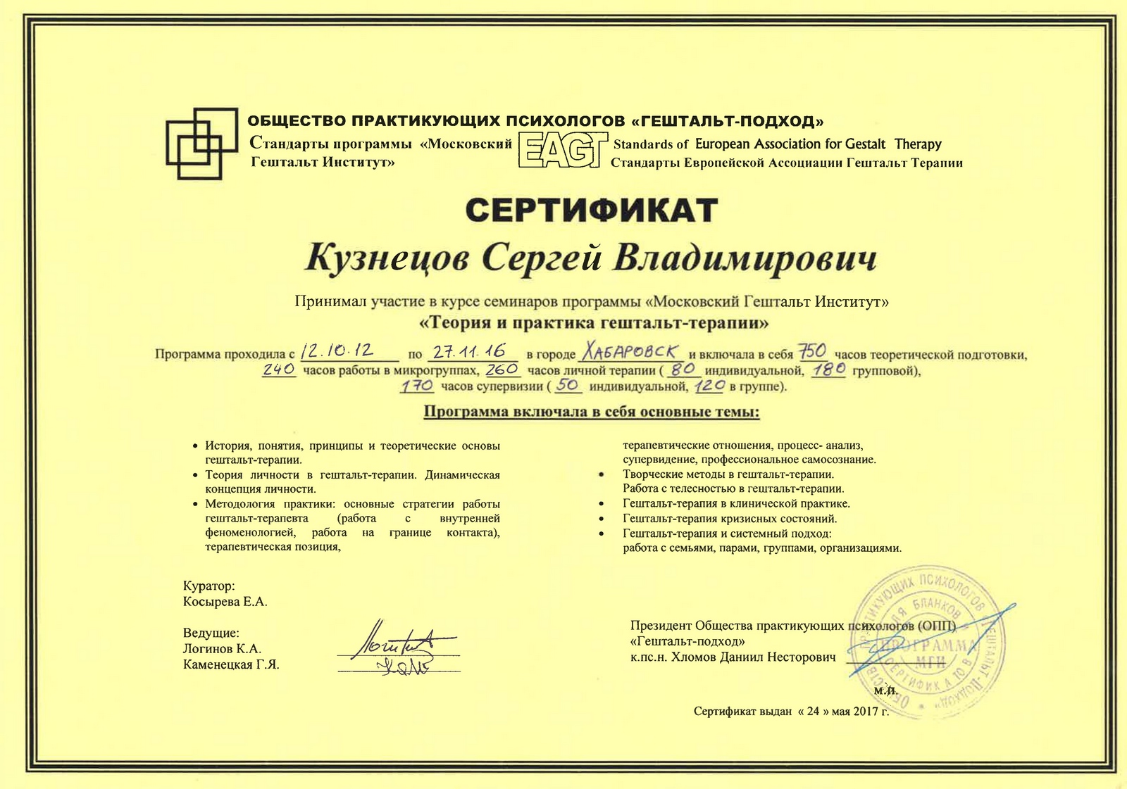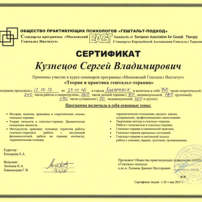 «Теория и практика гештальт-терапии» (ОПП «Гештальт-подход», программа «Московский Гештальт Институт», 2012-2017 гг. (1420 ч)