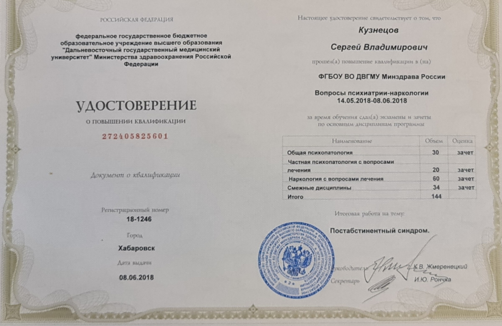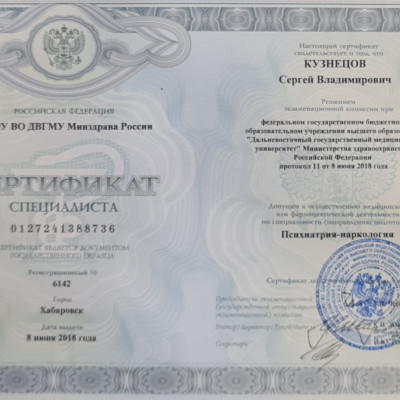 «Психиатрия-наркология» (Дальневосточный государственный медицинский университет, 2018 г.)