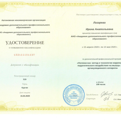 «Логомассаж: метод технологии коррекционного педагогического воздействия на мышцы лица и артикуляционного аппарата» (АНО «Академия дополнительного профессионального образования», 2020 г. (108 часов)