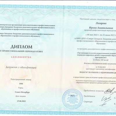 «Организация психолого-педагогических условий развития и поддержки одаренных детей в современном образовательном пространстве. Педагог по работе с одаренными детьми» (АНО ДПО «Северо-Западная Академия дополнительного профессионального образования и профессионального обучения», 2022 г. (340 часов)