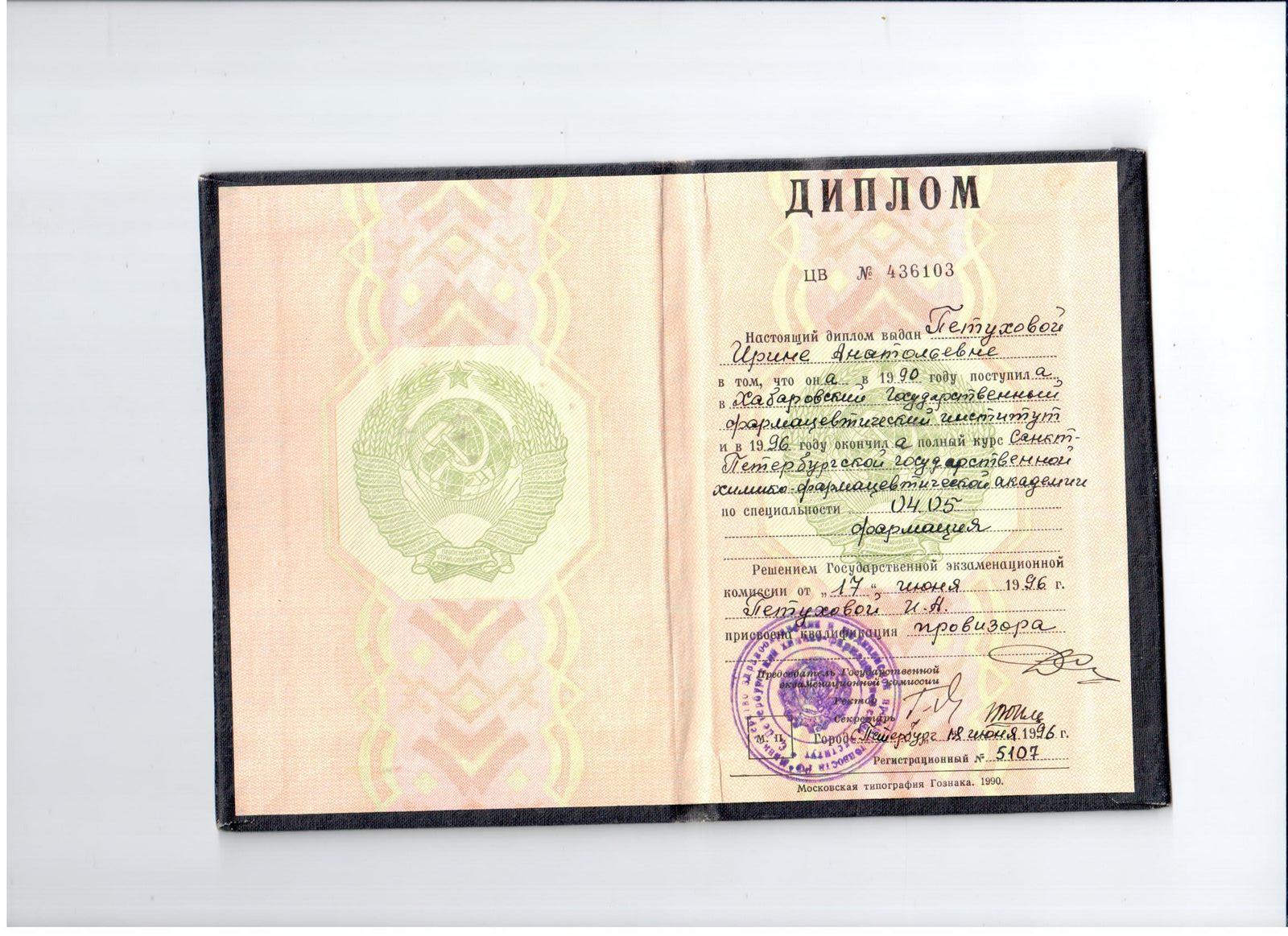 1996 г. ФГБУ ВО «Санкт-Петербургская государственная химико-фармацевтическая академия», специальность «Фармация»