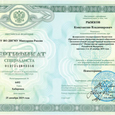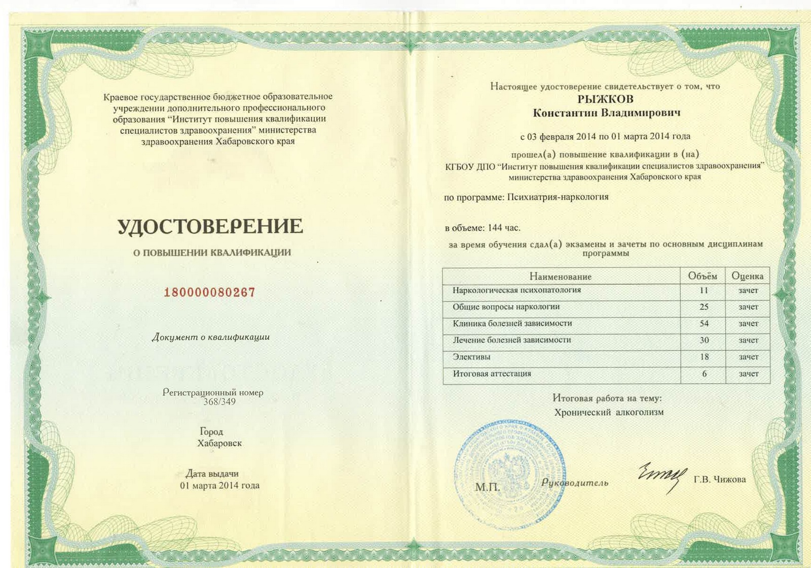 Хабаровский государственный медицинский институт. Специальность «Психиатр-нарколог», 1988 г.
