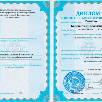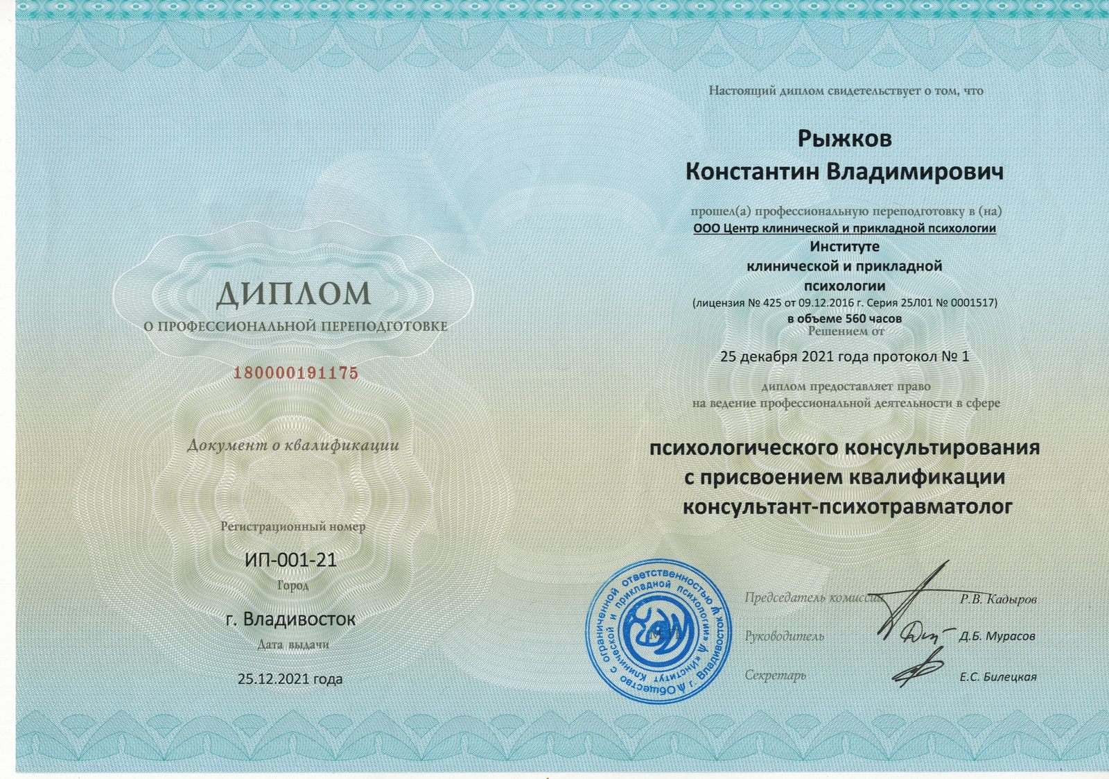 Профессиональная переподготовка «Профессиональная деятельность в сфере психологического консультирования с присвоением квалификации консультант-психотравматолог» (560 часов). Институт клинической и прикладной психологии, г. Владивосток, 2021г.
