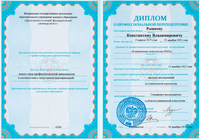 Международная докторская степень PHD по клинической психологии. ФГАОУВО Дальневосточный федеральный университет, г. Владивосток, 2022г. Тема диссертации «Разработка и апробация тренинговой программы коммуникативных навыков врачей эндокринологов в терапии остеопороза у возрастных пациентов»