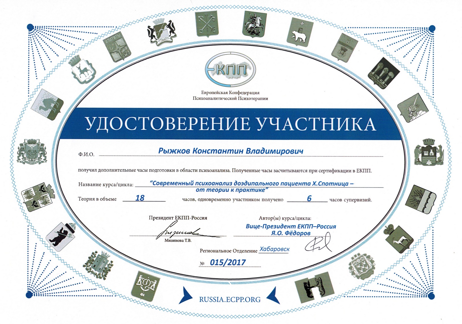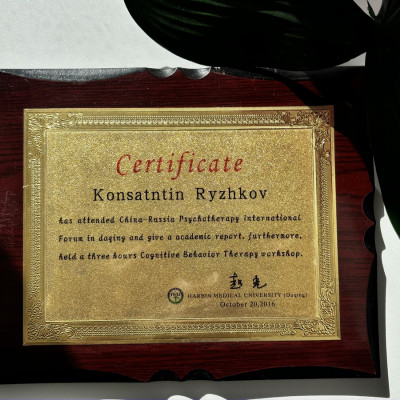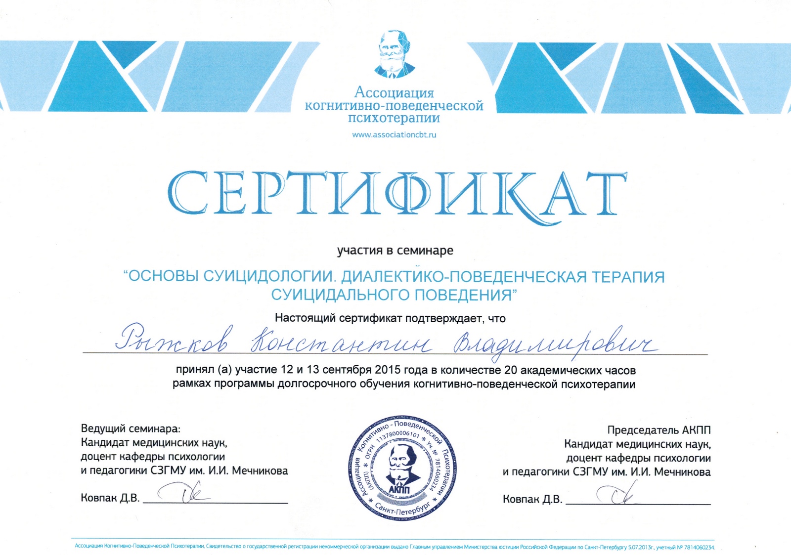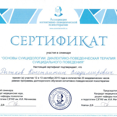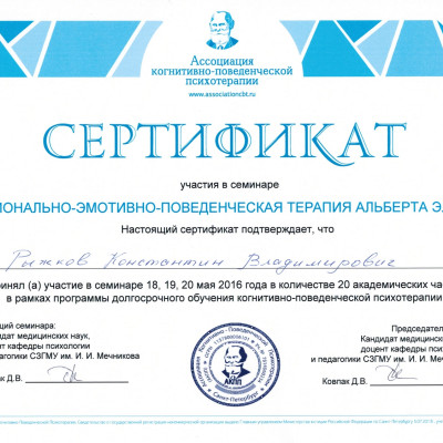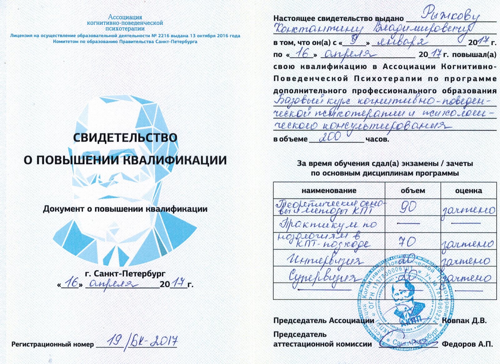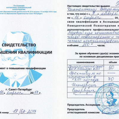 Дополнительное профессиональное образование по программе «Базовый курс когнитивно-поведенческой психотерапии и психологического консультирования» (200 часов). Ассоциация когнитивно-поведенческой психотерапии, Санкт Петербург, 2017г.