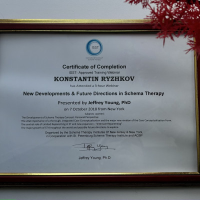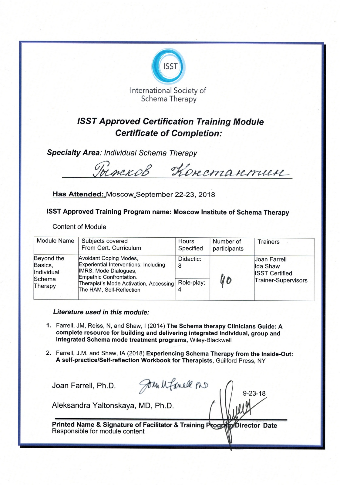 Курс сертификационного обучения международного сообщества ISST по схематерапии «Beyond the Basics, Individual Schema Therapy». International Society of Schema Therapy, 2018 г.