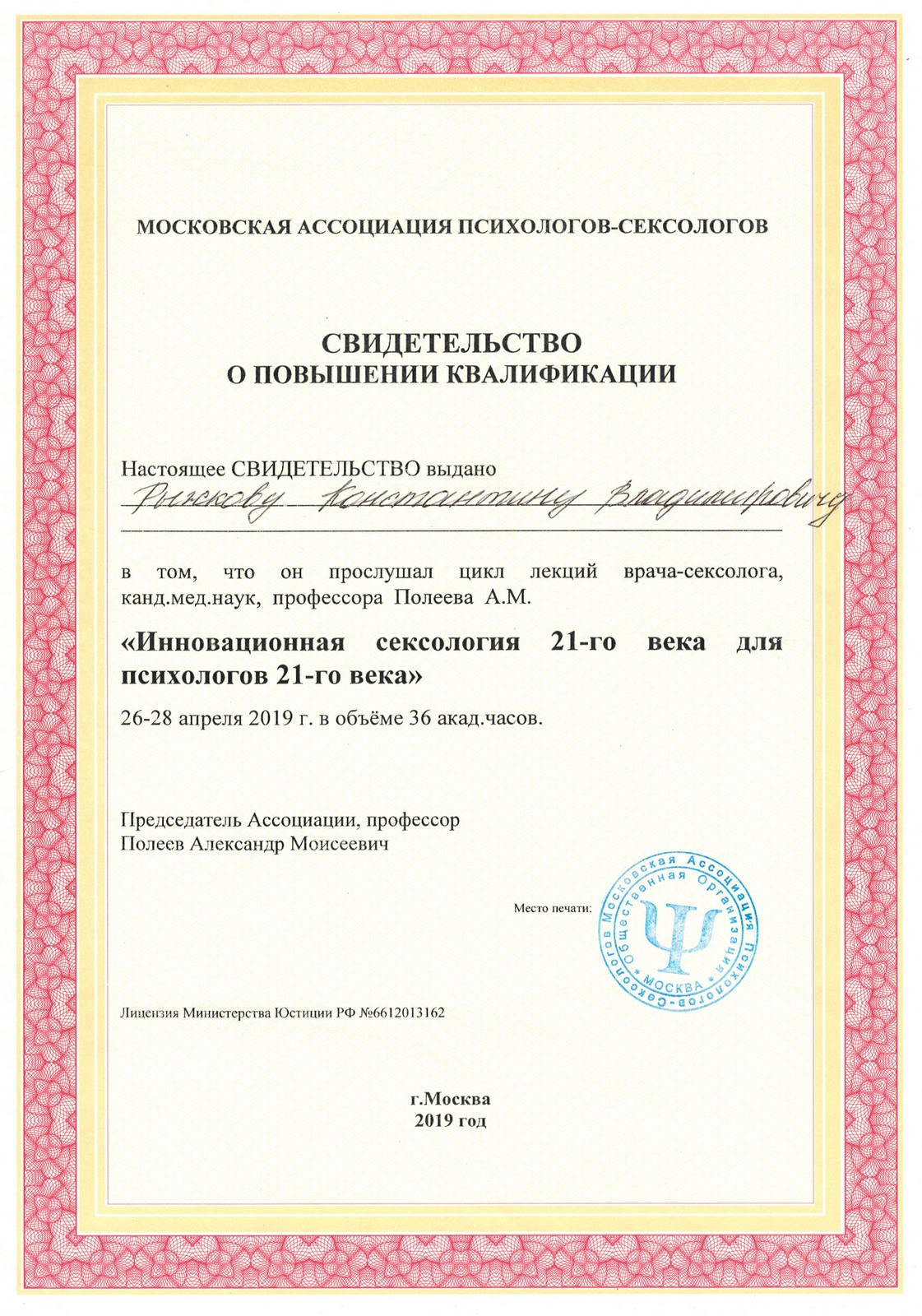 Повышение квалификации по программе «Инновационная сексология 21-го века для психологов 21-го века». Московская Ассоциация психологов-сексологов, г. Москва, 2019г.
