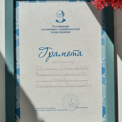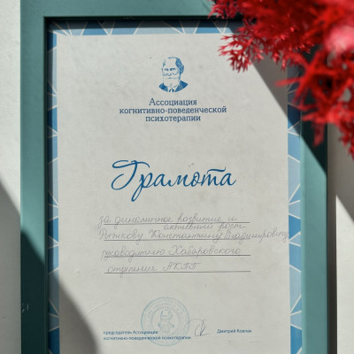 ● Грамота «За динамичное развитие и активный рост руководителю Хабаровского отделения Ассоциации Когнитивно-Поведенческой Психотерапии, 2016 г.