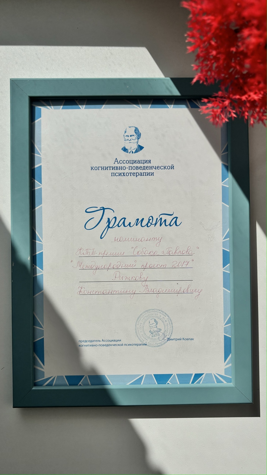 ● Премия «Собака Павлова» от Ассоциации Когнитивно-Поведенческой Психотерапии за международные проекты в 2017 г.