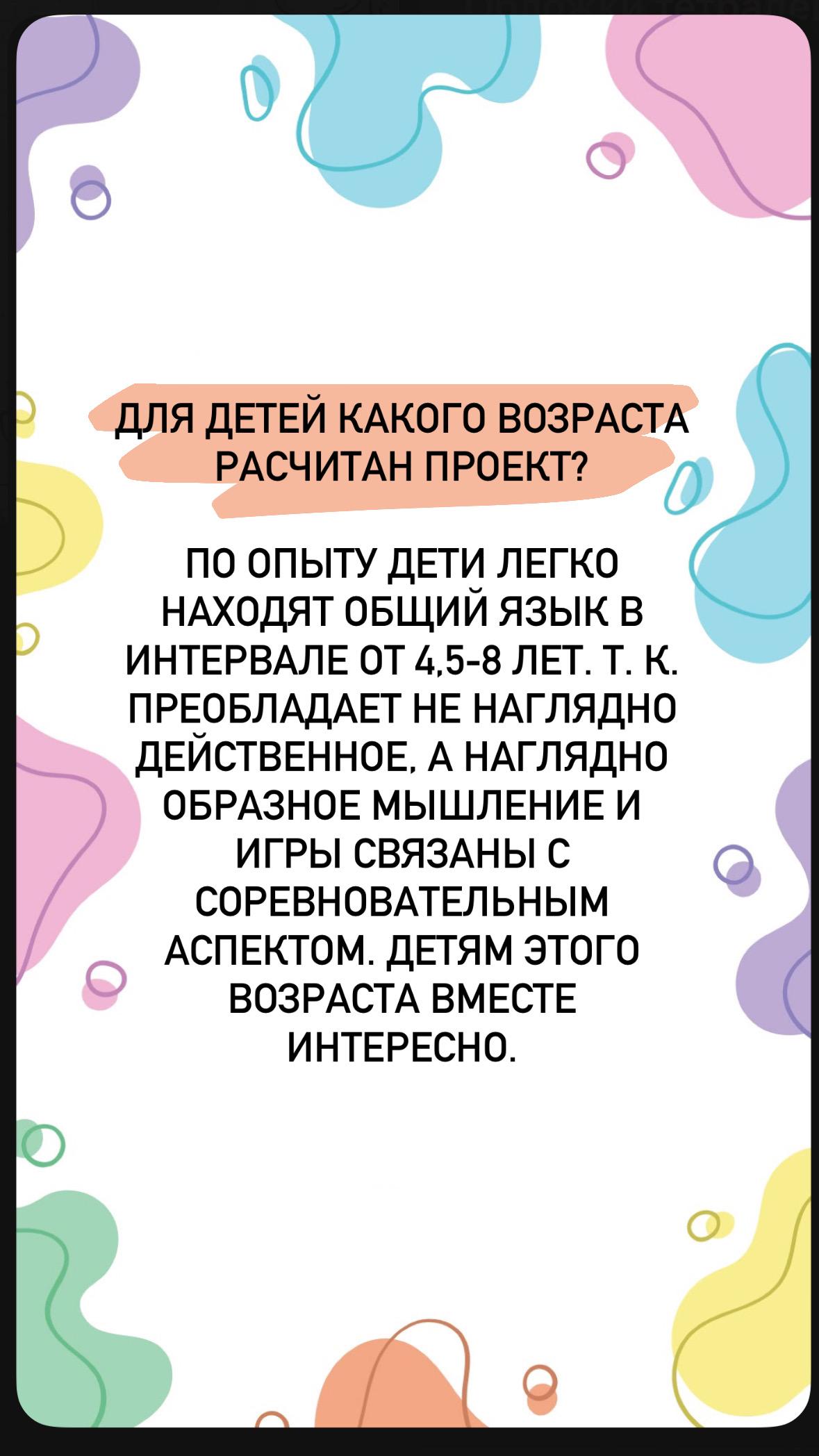 По опыту дети легко находят общий язык в интервале от 4,5-8 лет. Т. К. Преобладает не наглядно действенное, а наглядно образное мышление и игры связаны с соревновательным аспектом. Детям этого возраста вместе интересно.