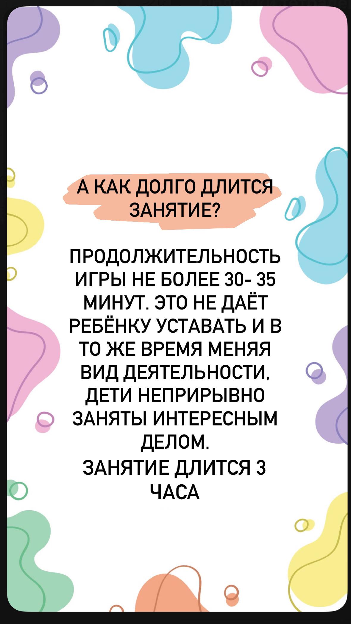 Продолжительность игры не более 30-35 минут. Это не даёт ребёнку уставать и в то же время меняя вид деятельности, дети неприрывно заняты интересным делом.