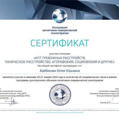 7. Январь 2024 «КПТ тревожных расстройств. Паническое расстройство. Агорафобия. Социофобия и др.»;