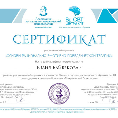 «Основы РЭПТ» (Ассоциация когнитивно-поведенческой психотерапии, 2021г. (20 ч)