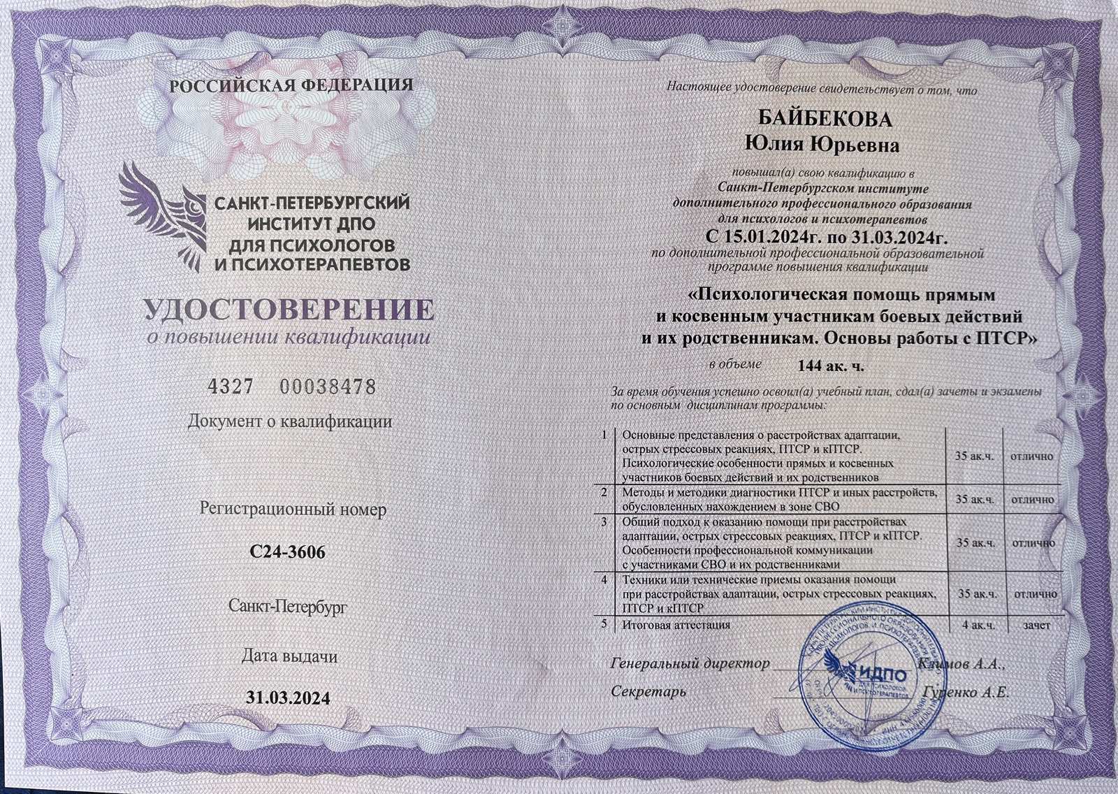 «Психологическая помощь прямым и косвенным участникам боевых действий и их родственникам. Основы работы с ПТСР» (Санкт-Петербургский Институт ДПО для психологов и психотерапевтов, 2024г (144ч)
