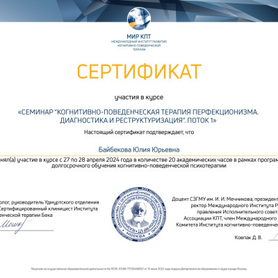 «Когнитивно-поведенческая терапия перфекционизма. Диагностика и реструктуризация» (Международный институт развития когнитивно-поведенческой терапии, 2024г. (20 ч)b>