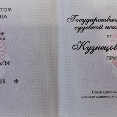 Кандидат медицинских наук (Государственный научный центр социальной и судебной психиатрии имени В.П. Сербского г. Москва, 2009 г.)