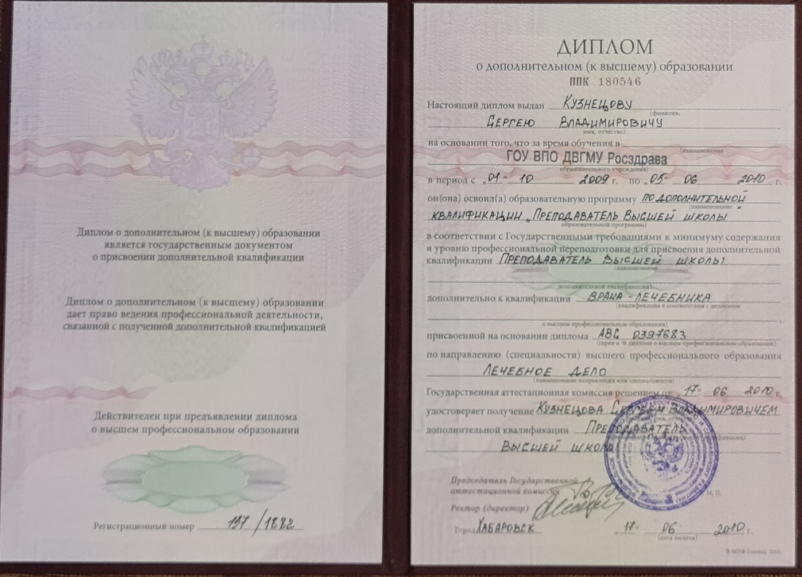 «Преподаватель Высшей школы» (Дальневосточный государственный медицинский университет г. Хабаровск, 2009-2010 гг.)