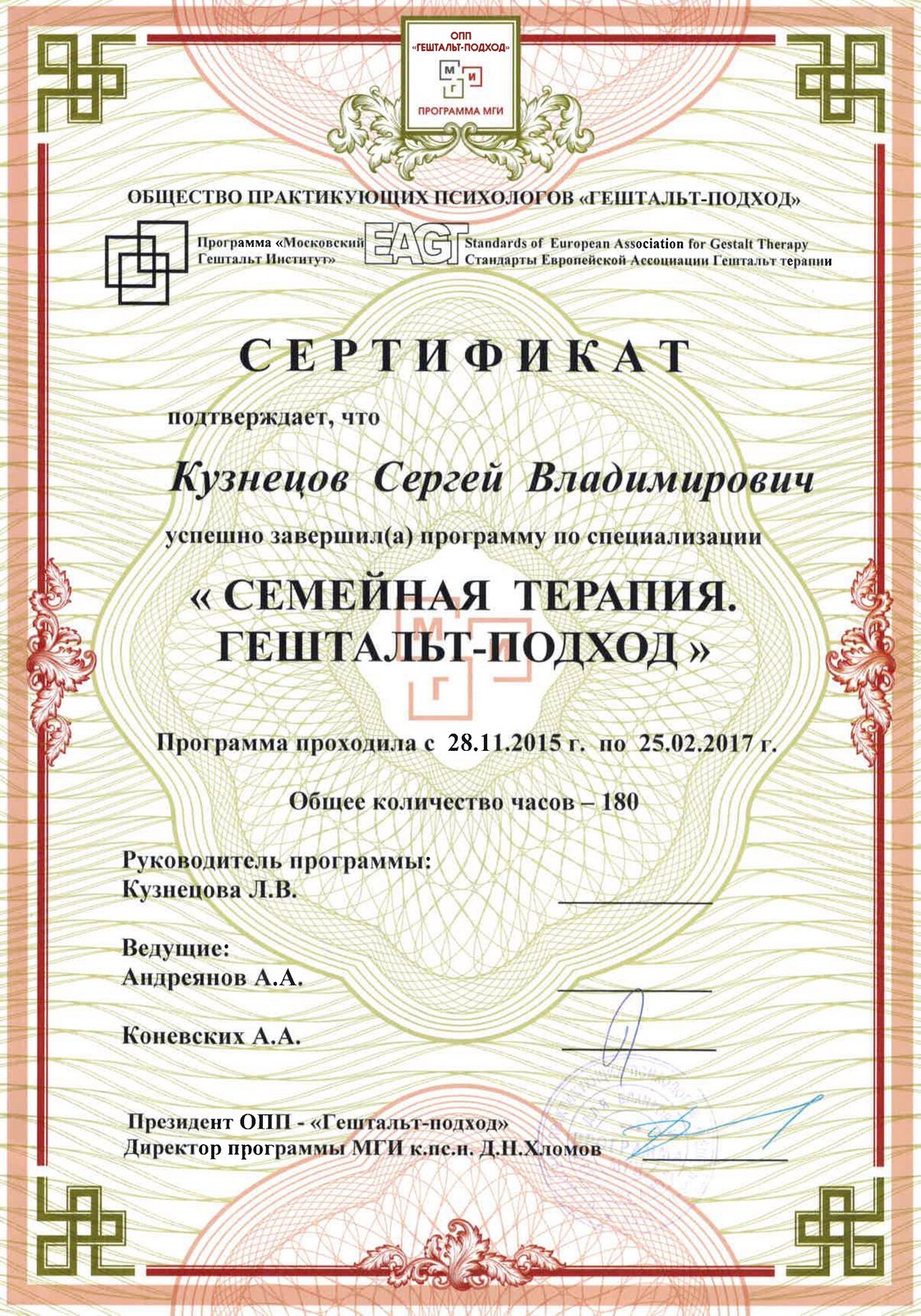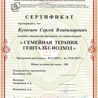 «Семейная терапия. Гештальт-подход» (ОПП «Гештальт-подход», программа «Московский Гештальт Институт», 2015-2017 гг. (180ч)