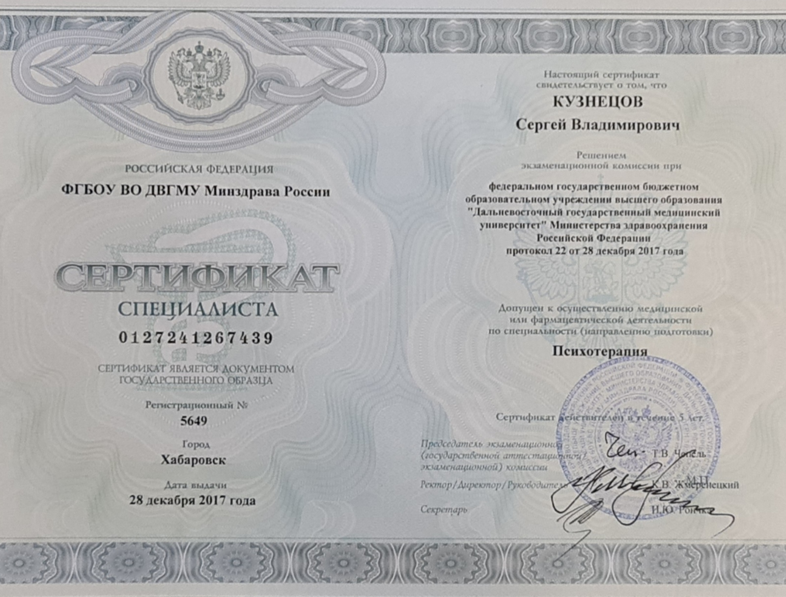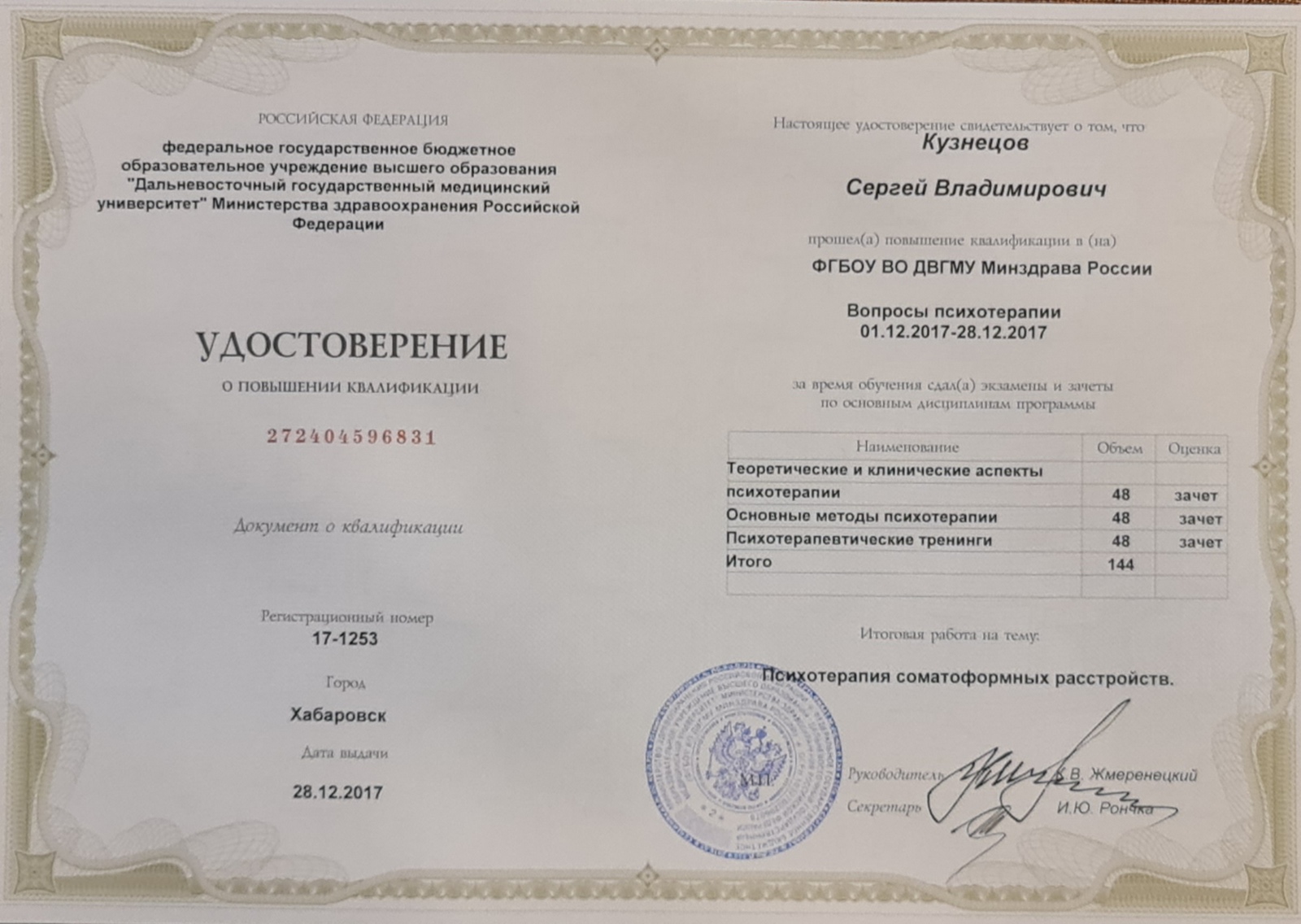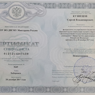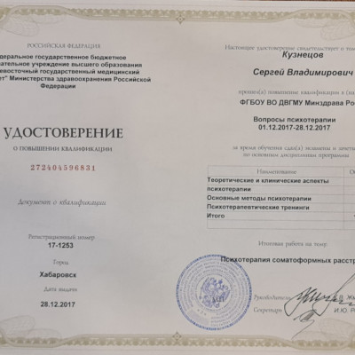 «Психотерапия» (Дальневосточный государственный медицинский университет, 2017 г.)