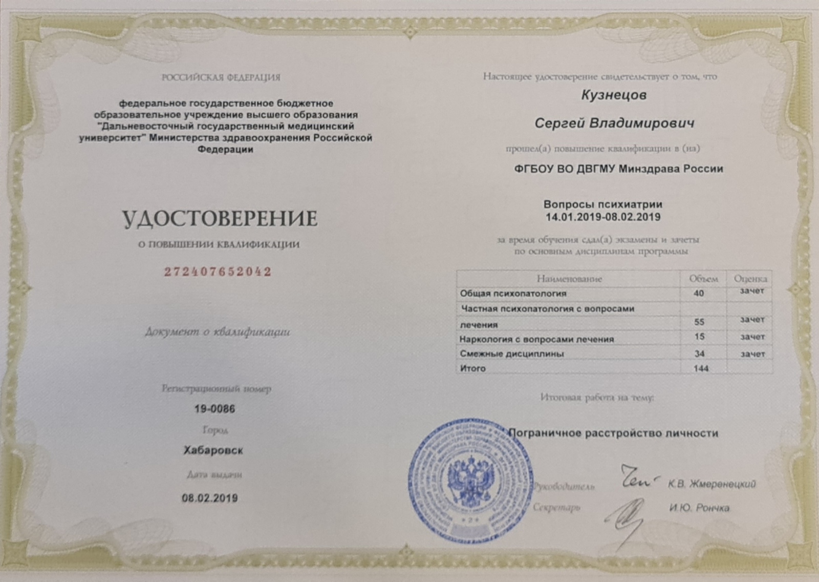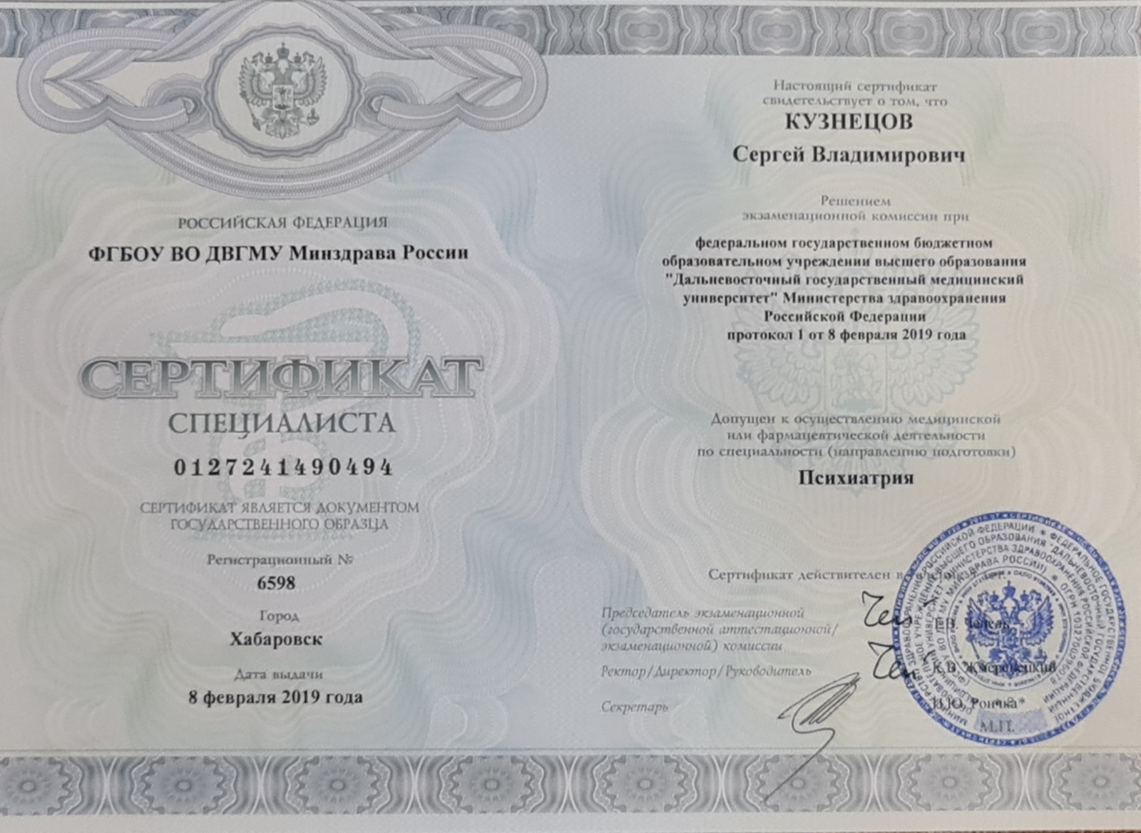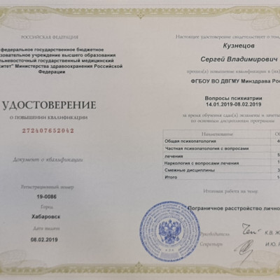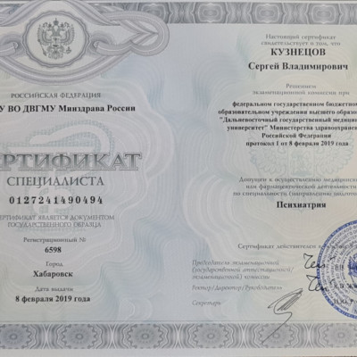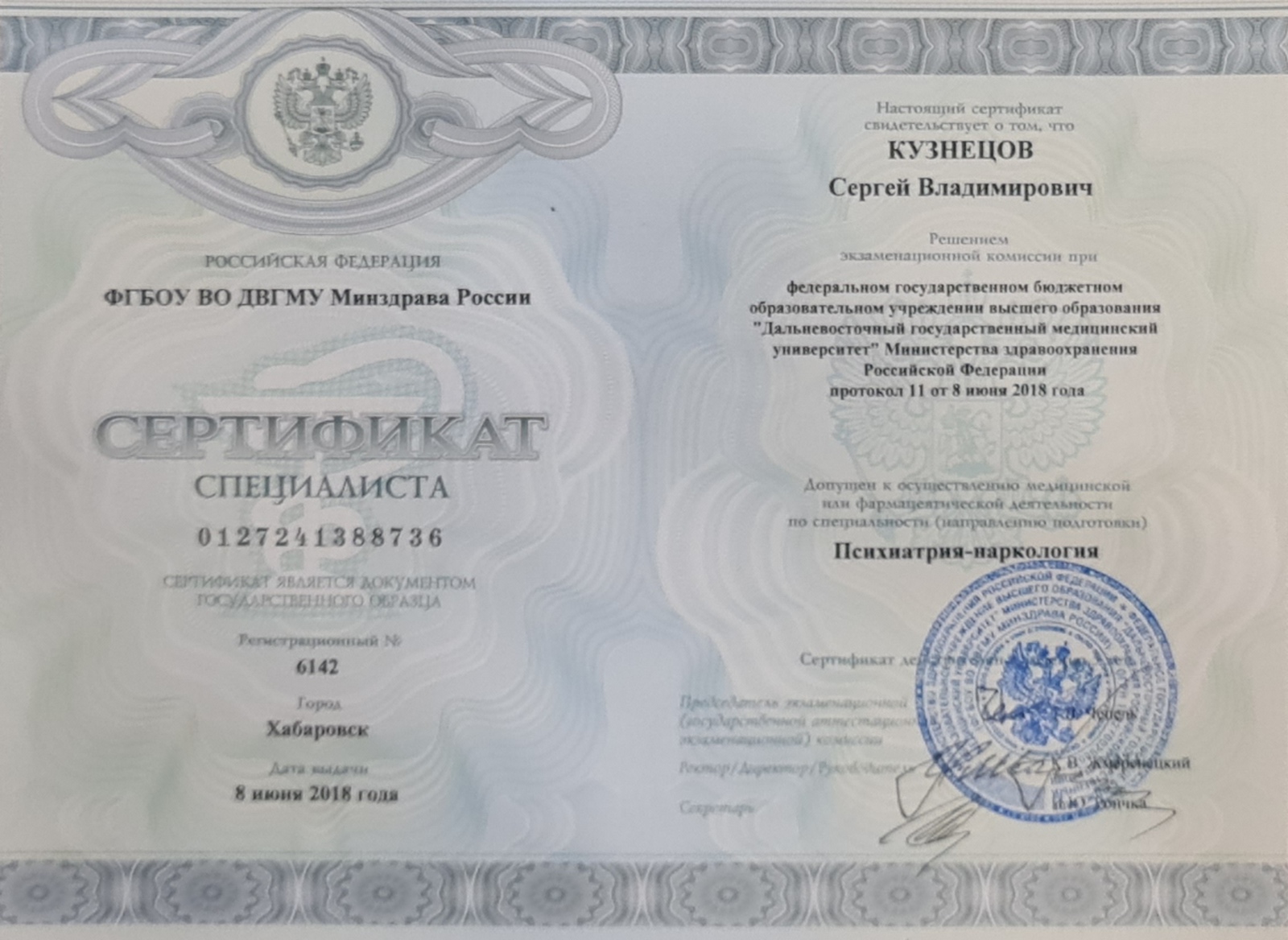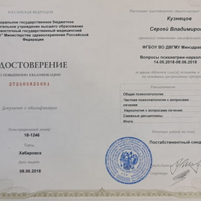 «Психиатрия-наркология» (Дальневосточный государственный медицинский университет, 2018 г.)