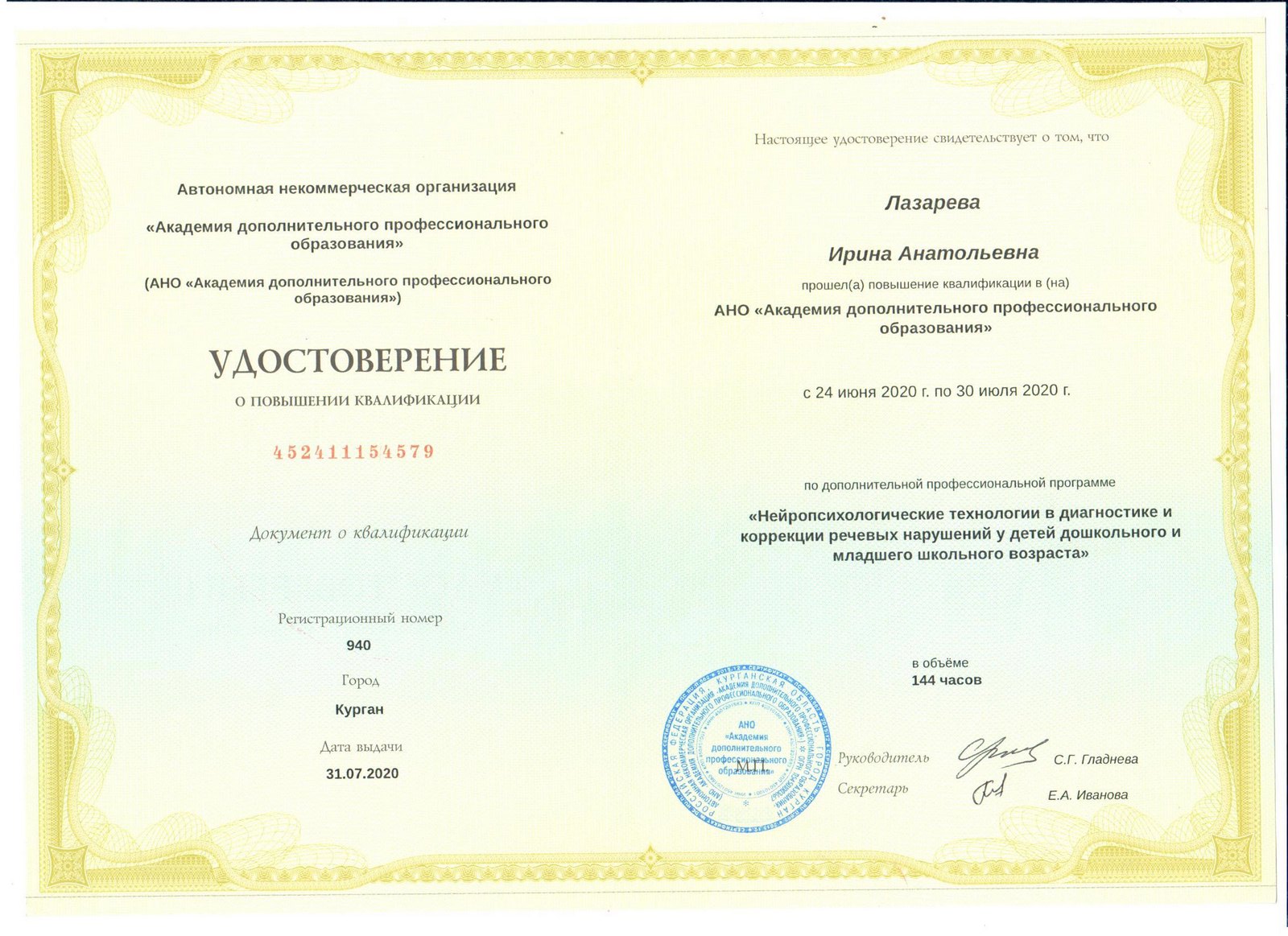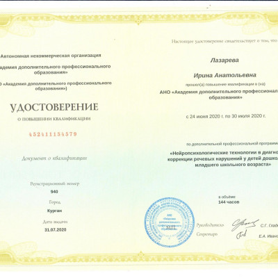 «Нейропсихологические технологии в диагностике и коррекции речевых нарушений у детей дошкольного и младшего школьного возраста» (АНО «Академия дополнительного профессионального образования», 2020 г. (144 часа)