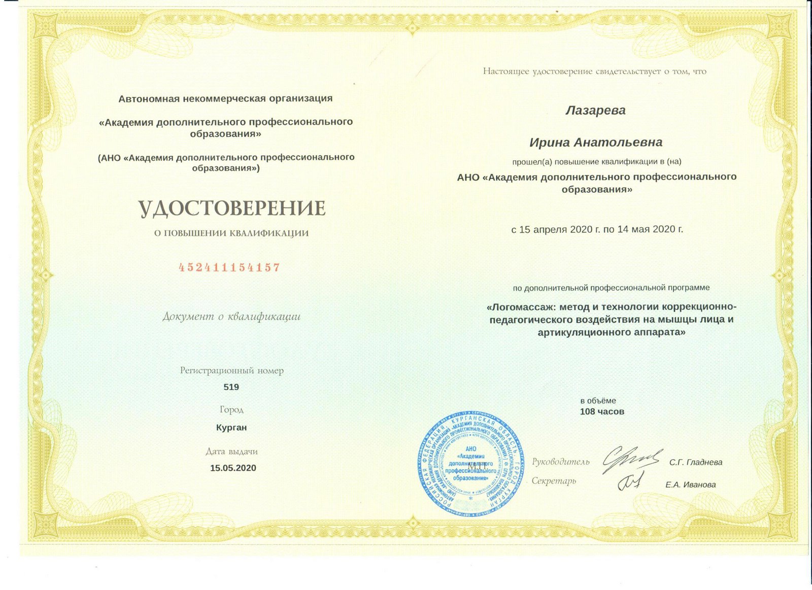 «Логомассаж: метод технологии коррекционного педагогического воздействия на мышцы лица и артикуляционного аппарата» (АНО «Академия дополнительного профессионального образования», 2020 г. (108 часов)