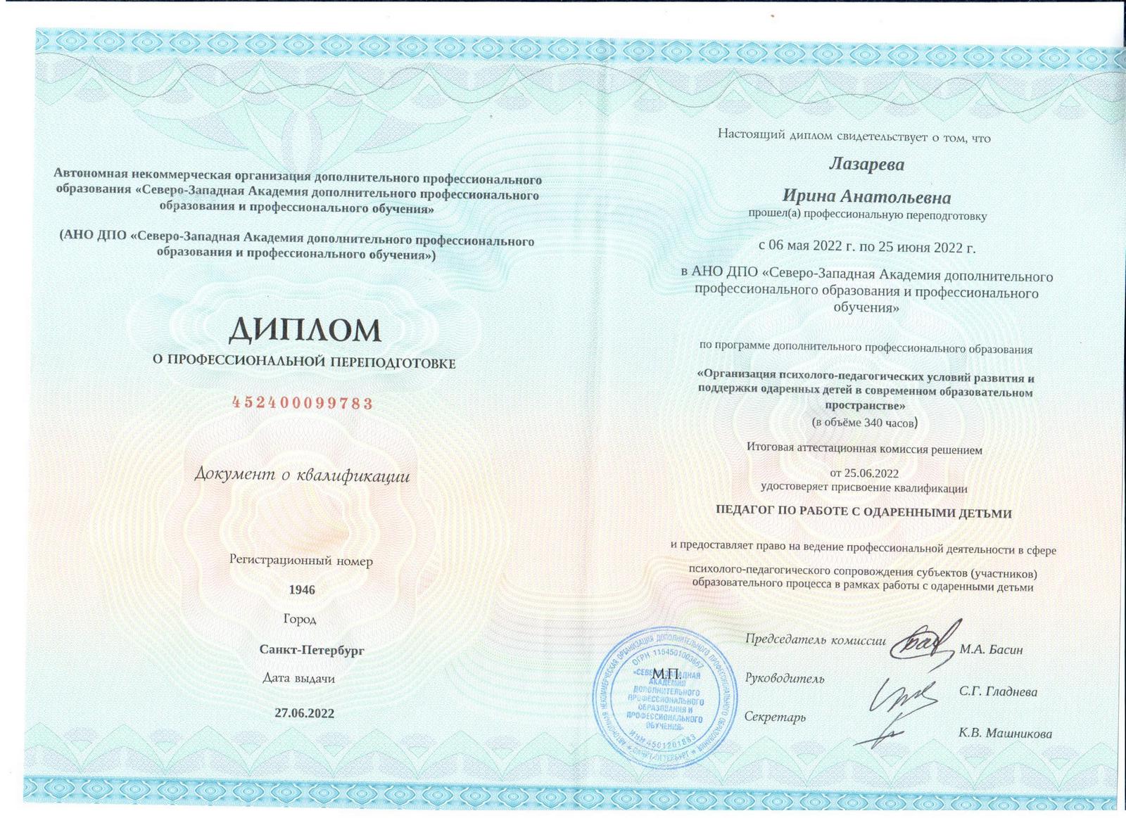 «Организация психолого-педагогических условий развития и поддержки одаренных детей в современном образовательном пространстве. Педагог по работе с одаренными детьми» (АНО ДПО «Северо-Западная Академия дополнительного профессионального образования и профессионального обучения», 2022 г. (340 часов)