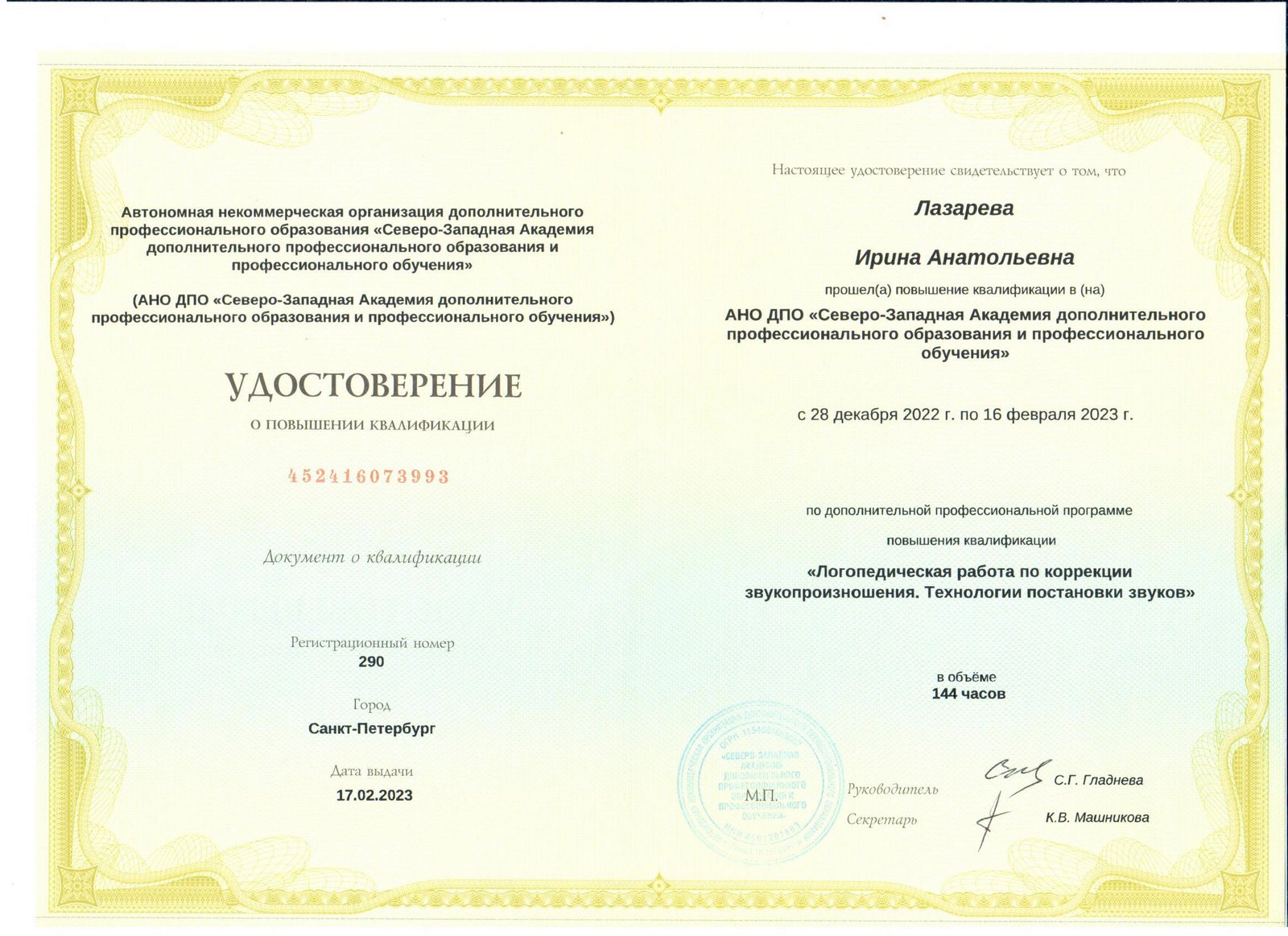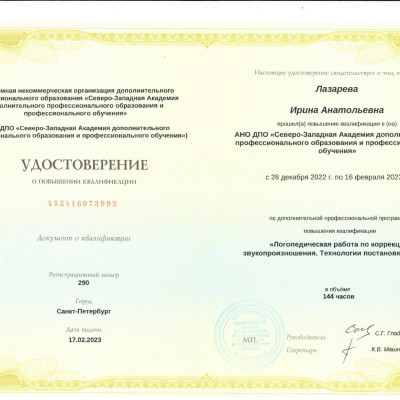 «Логопедическая работа по коррекции звукопроизношения. Технологии постановки звуков» (АНО ДПО «Северо-Западная Академия дополнительного профессионального образования и профессионального обучения», 2023 г. (144 часа)