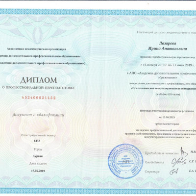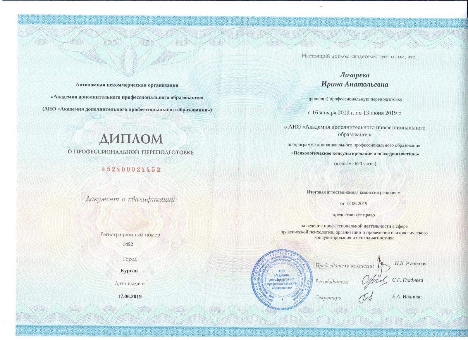 2019 г. АНО «Академия дополнительного профессионального образования» специальность — «Психологическое консультирование и психодиагностика» (620 часов)