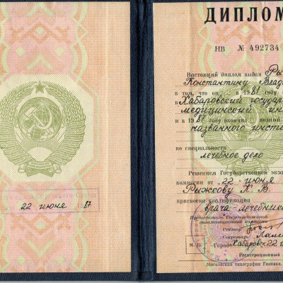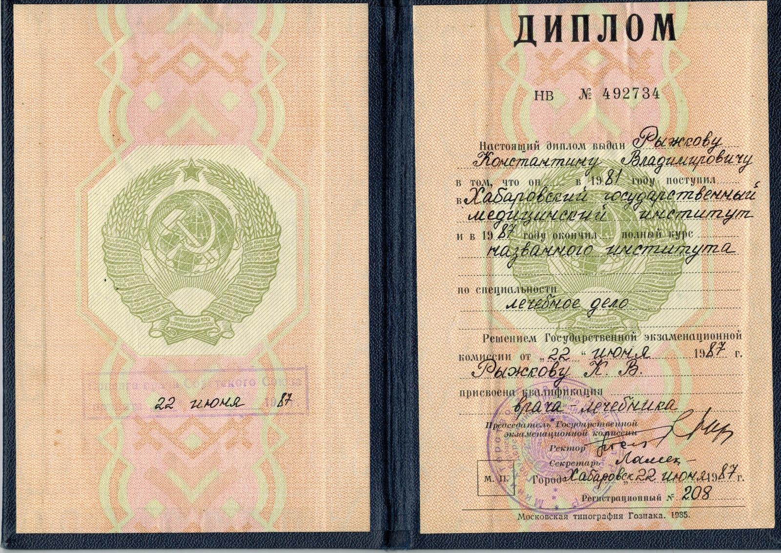 Хабаровский государственный медицинский институт. Специальность «Лечебное дело», 1987 г.