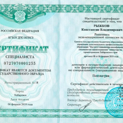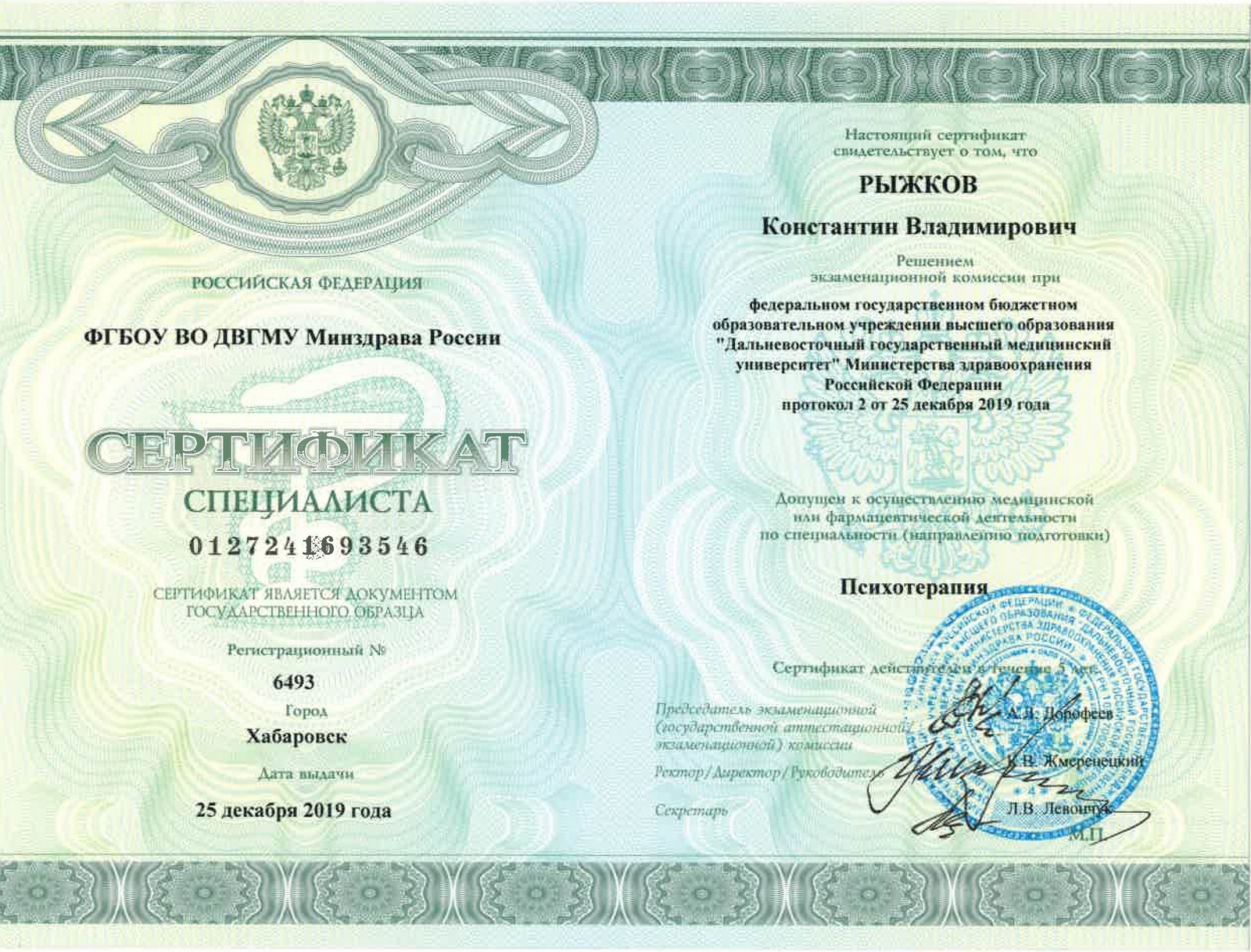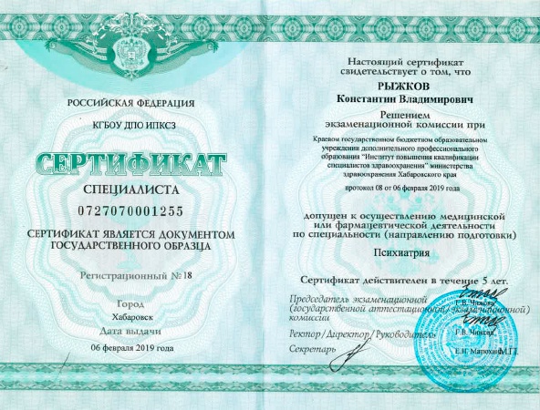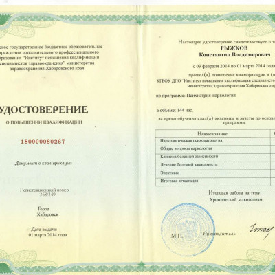 Хабаровский государственный медицинский институт. Специальность «Психиатр-нарколог», 1988 г.