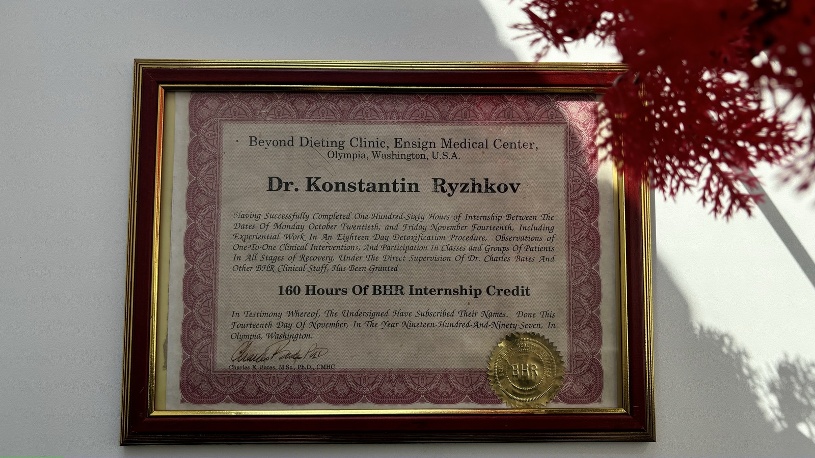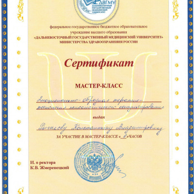 Международная докторская степень PHD по клинической психологии. ФГАОУВО Дальневосточный федеральный университет, г. Владивосток, 2022г. Тема диссертации «Разработка и апробация тренинговой программы коммуникативных навыков врачей эндокринологов в терапии остеопороза у возрастных пациентов»