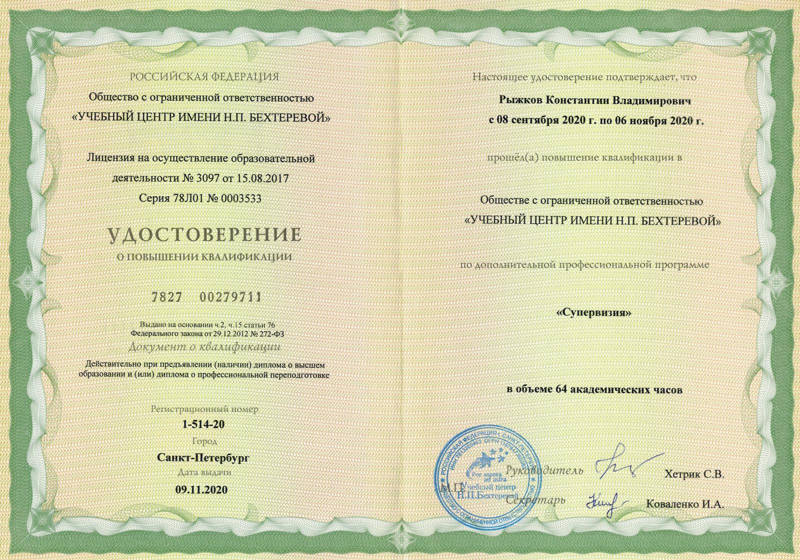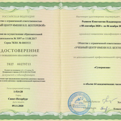 Повышение квалификации по дополнительной профессиональной программе «Супервизия». Учебный центр им. Н.П. Бехтеревой, Санкт Петербург, 2020г.