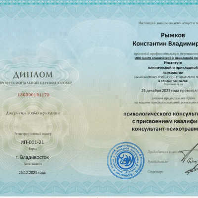 Профессиональная переподготовка «Профессиональная деятельность в сфере психологического консультирования с присвоением квалификации консультант-психотравматолог» (560 часов). Институт клинической и прикладной психологии, г. Владивосток, 2021г.