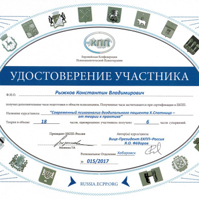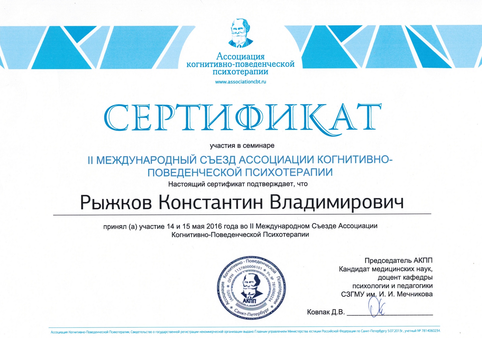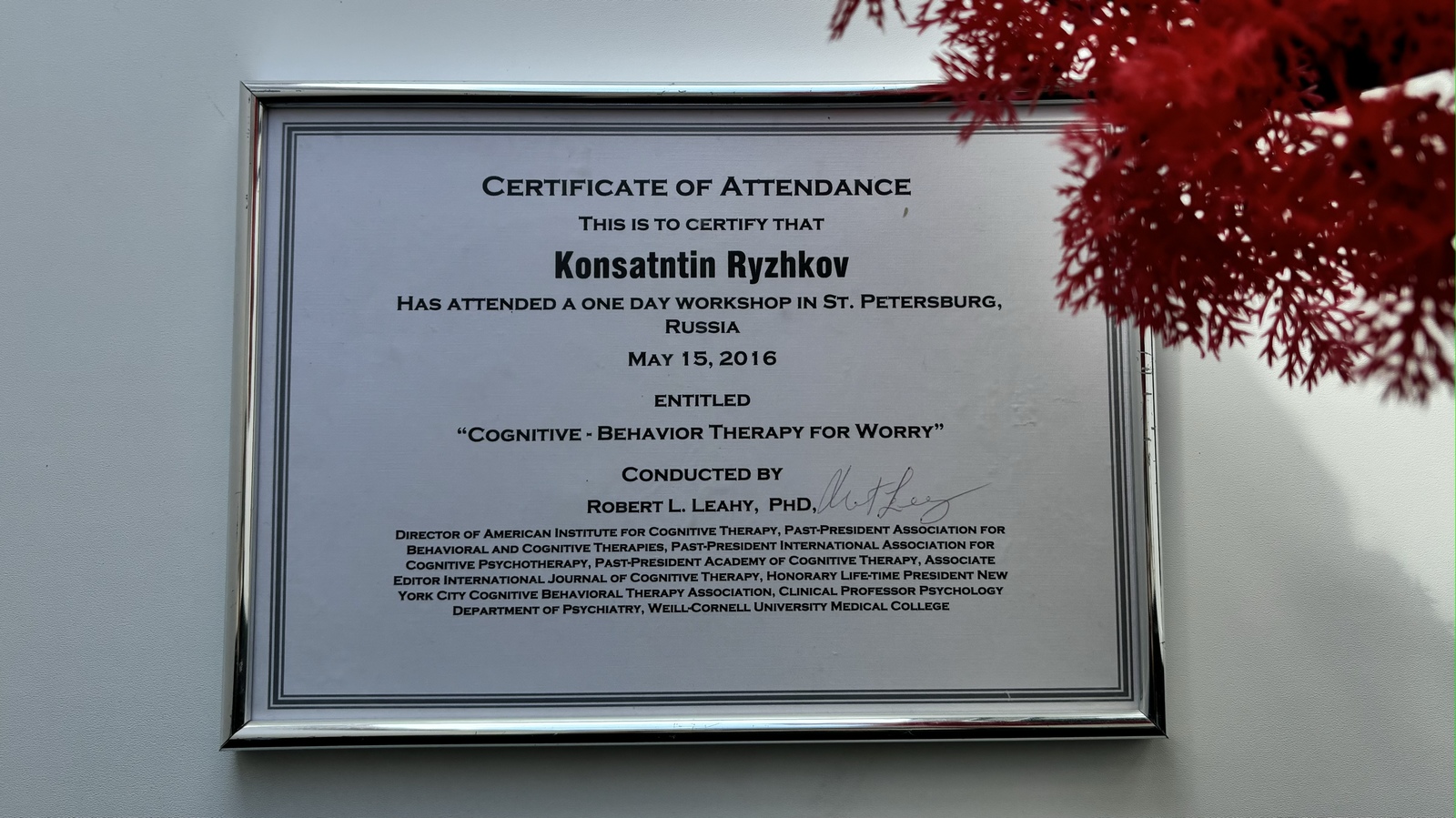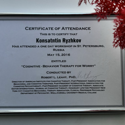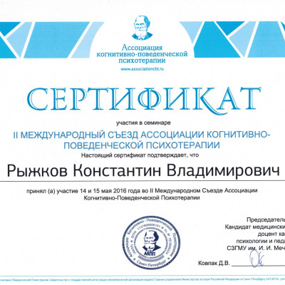 Дополнительное профессиональное образование по программе «Базовый курс когнитивно-поведенческой психотерапии и психологического консультирования» (200 часов). Ассоциация когнитивно-поведенческой психотерапии, Санкт Петербург, 2017г.