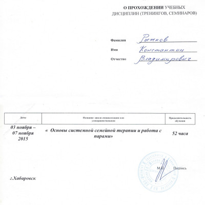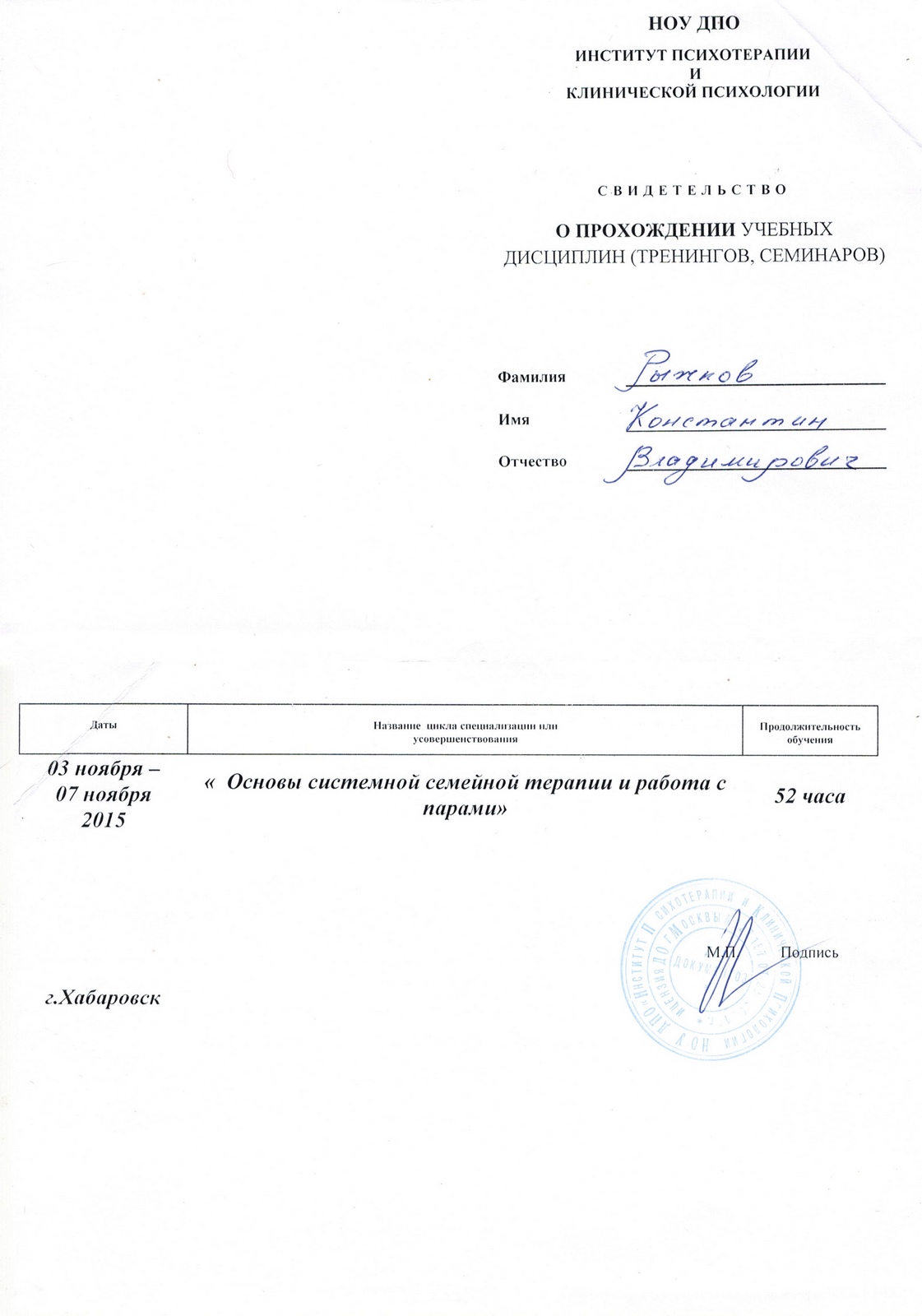 Цикл специализации «Основы системной семейной терапии и работа с парами». НОУ ДПО «Институт психотерапии и клинической психологии», 2015г