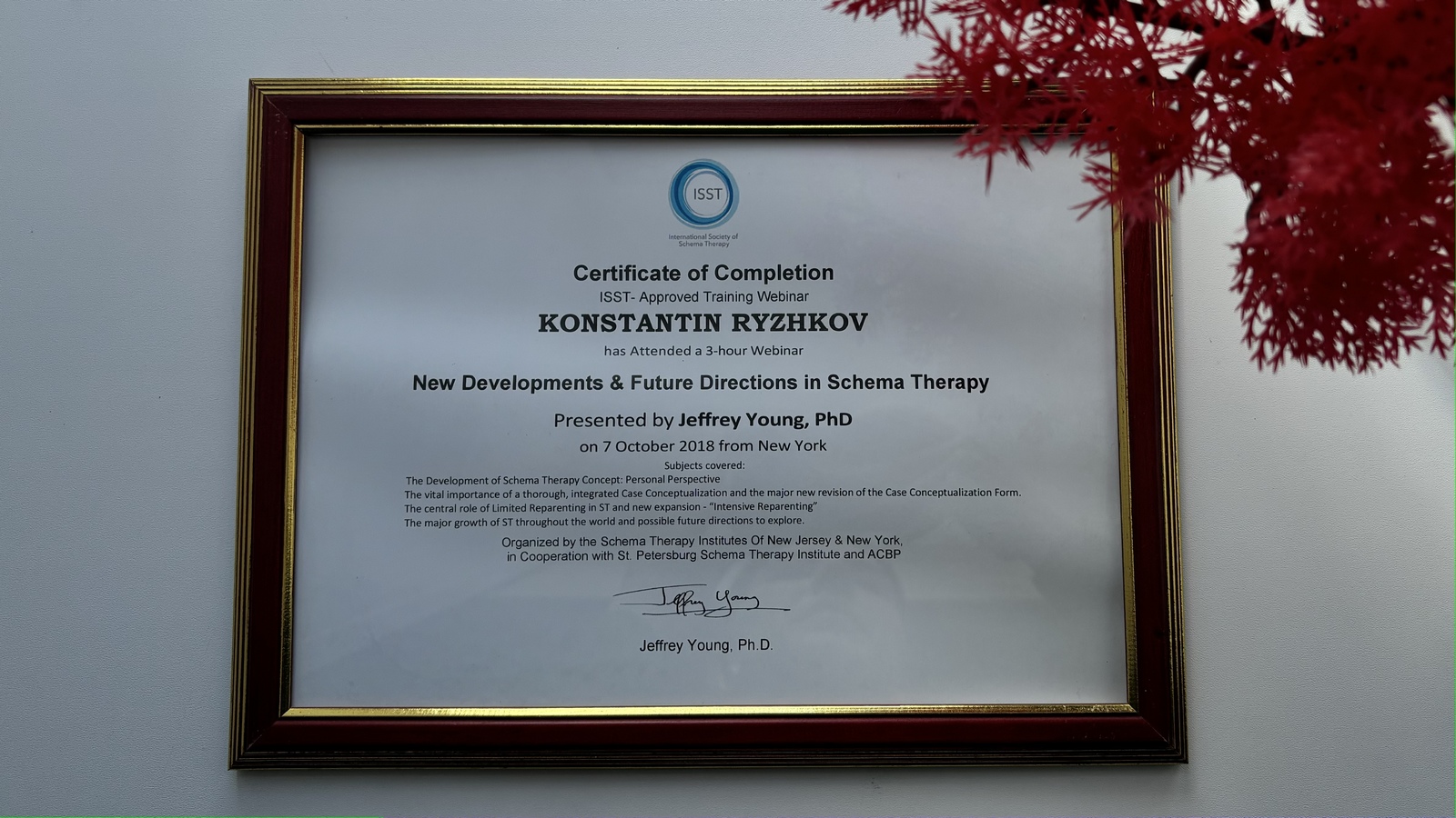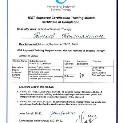Курс сертификационного обучения международного сообщества ISST по схематерапии «Beyond the Basics, Individual Schema Therapy». International Society of Schema Therapy, 2018 г.