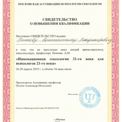 Повышение квалификации по программе «Инновационная сексология 21-го века для психологов 21-го века». Московская Ассоциация психологов-сексологов, г. Москва, 2019г.