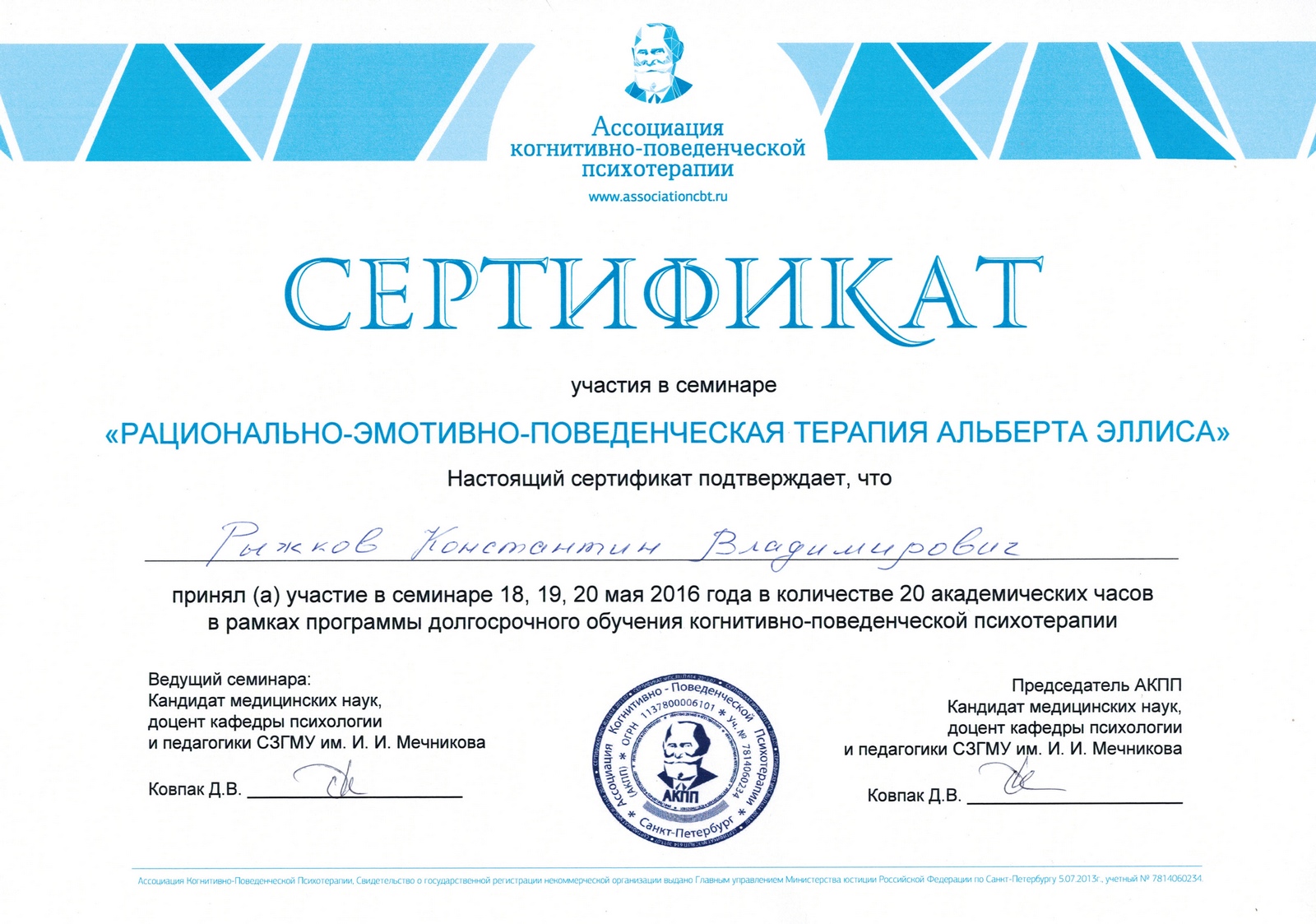 Рационально-эмотивно-поведенческая терапия А. Эллиса. Ассоциация когнитивно-поведенческой психотерапии, Санкт Петербург, 2016г.